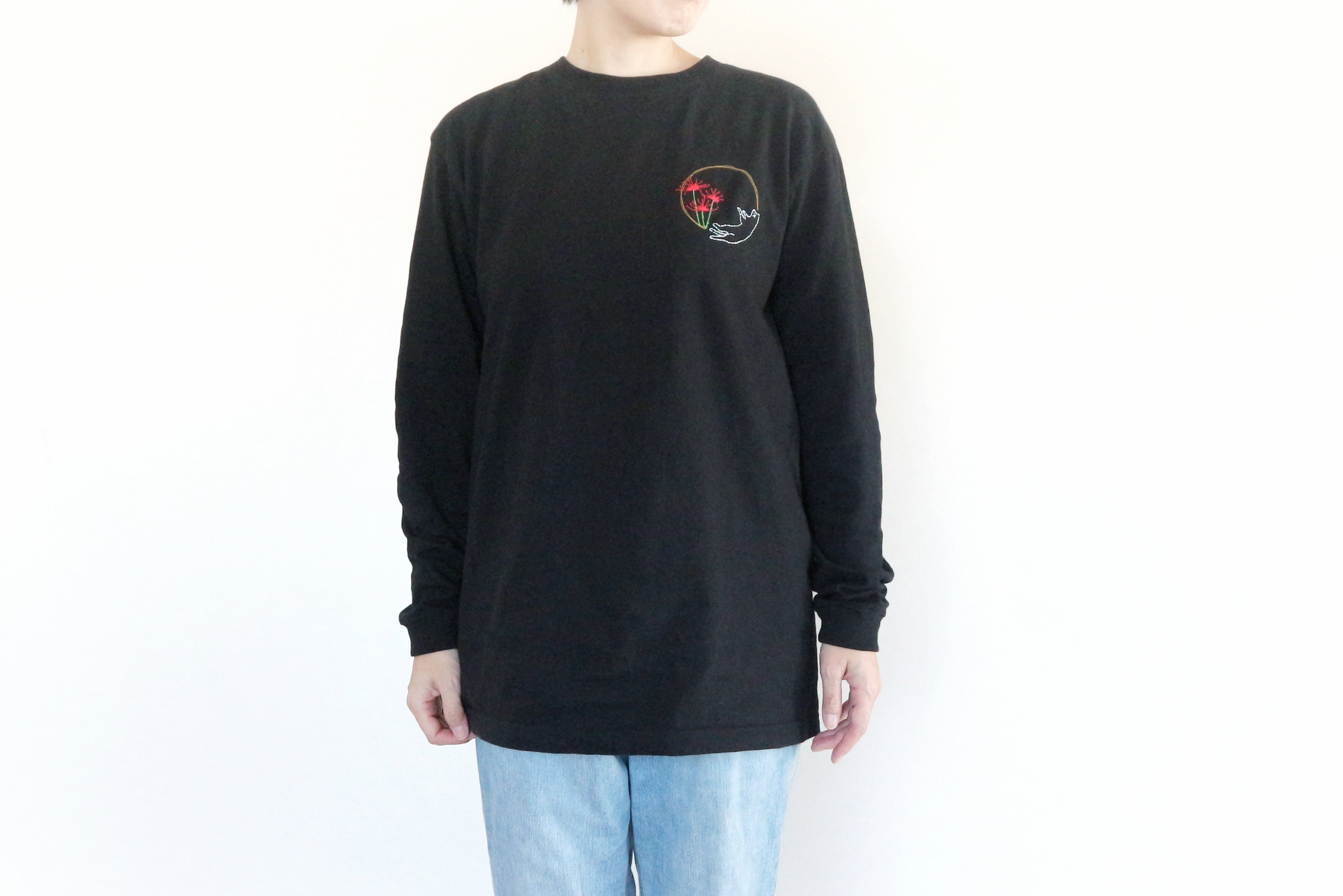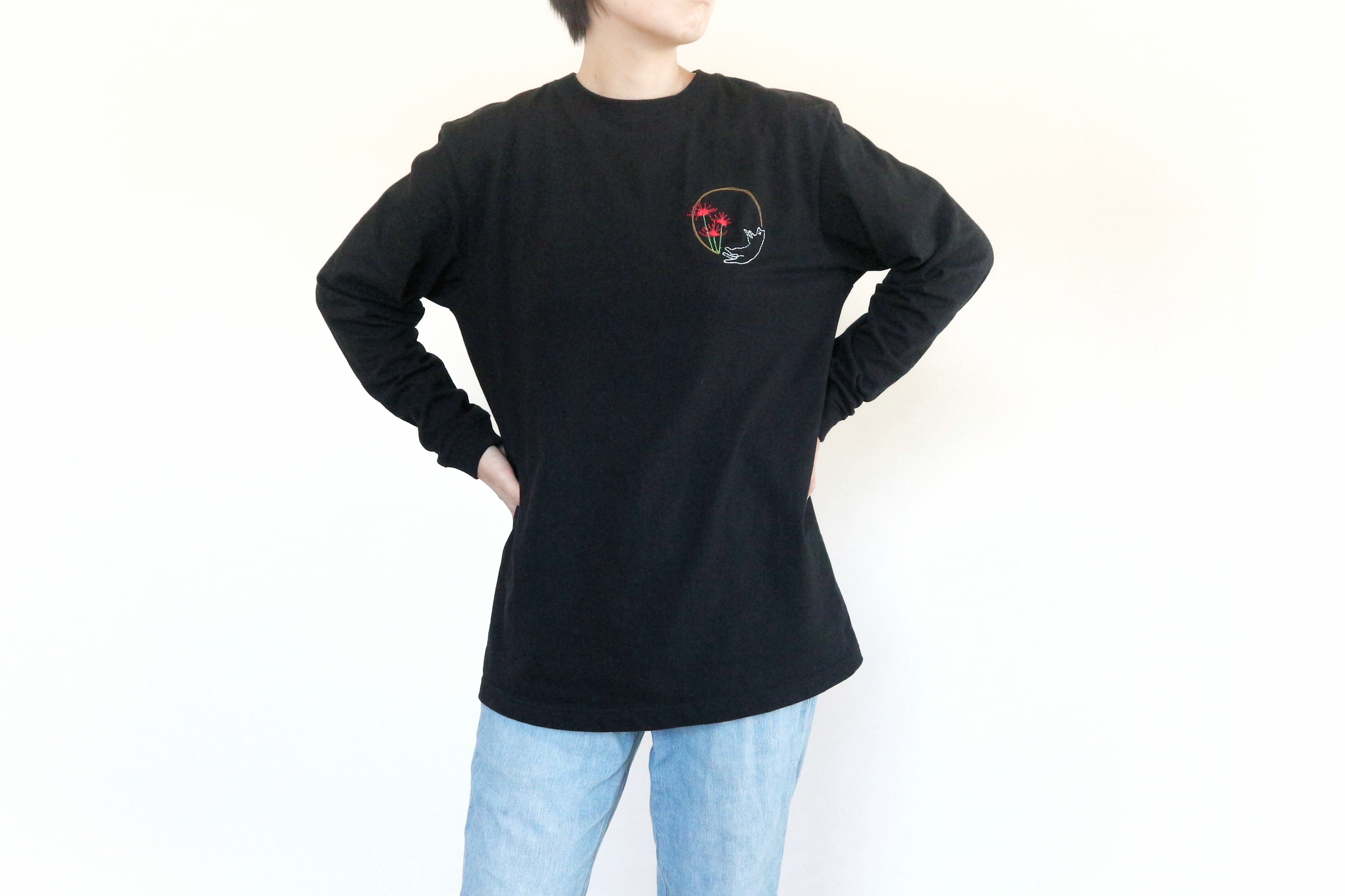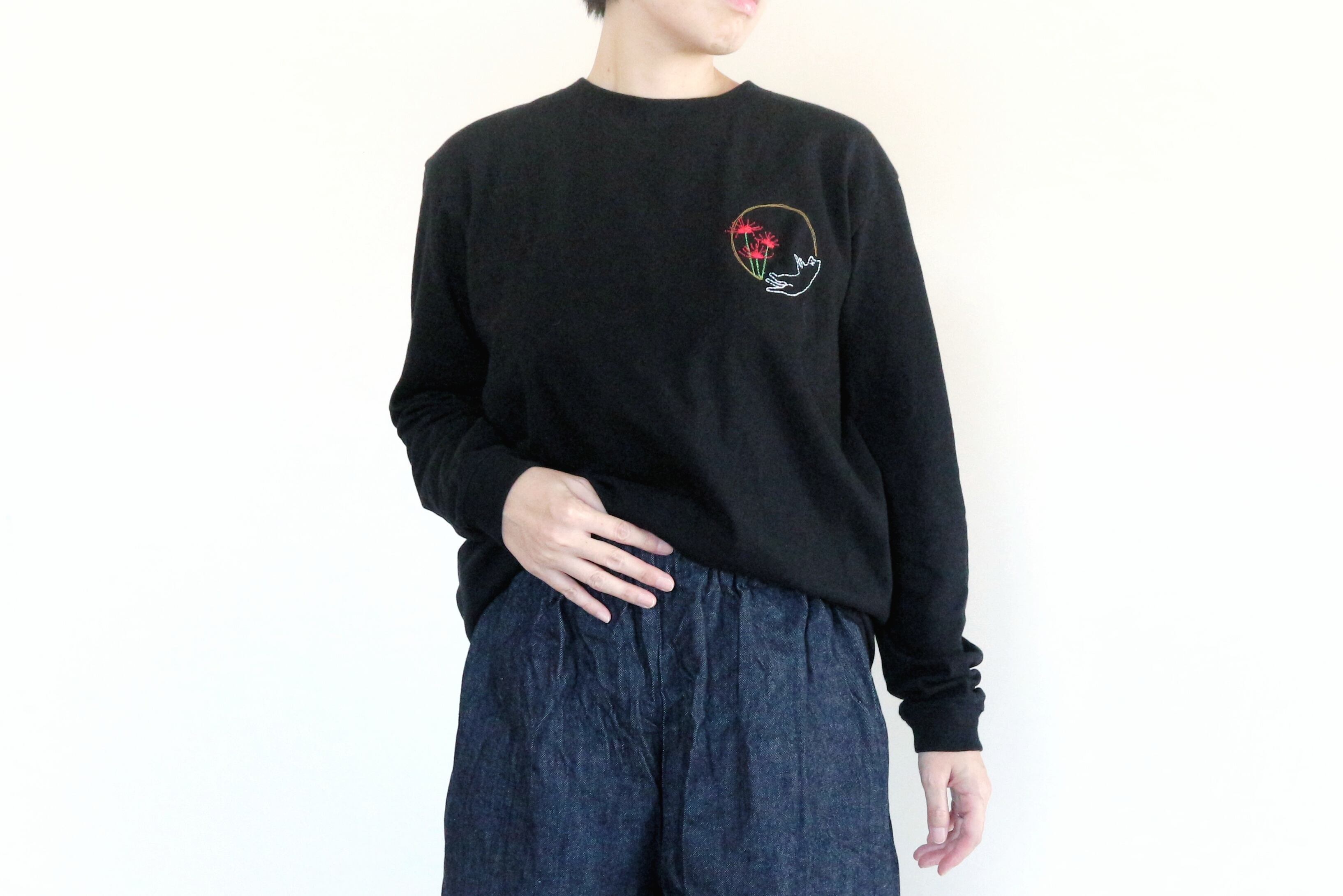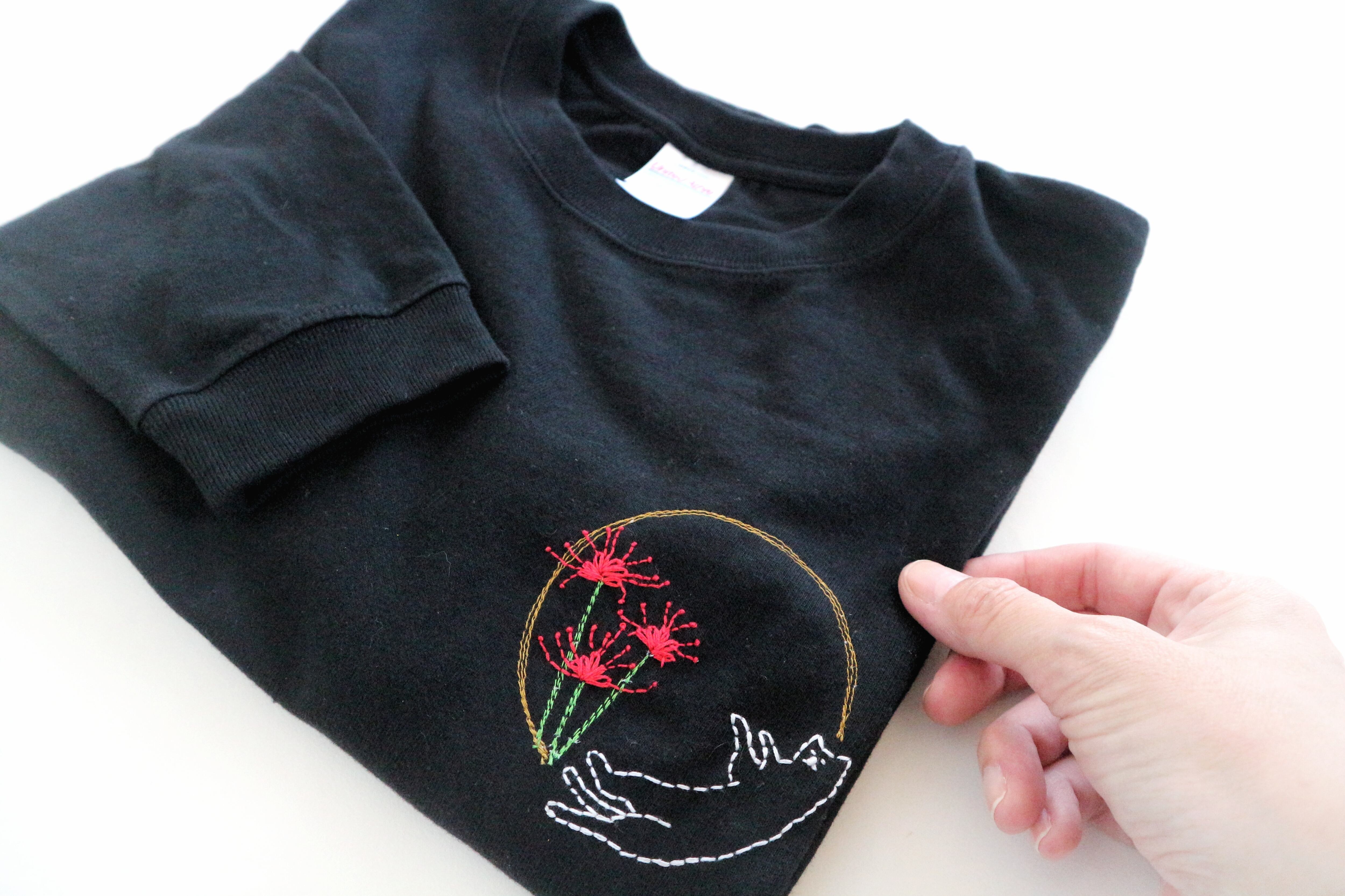 彼岸花の赤を見つけると、子どもの頃に母と歩いた散歩道を思い出します。当時は「ひがんばぎ」と呼んでいたそうです(笑)──そんな母との小さな記憶を刺繍に込めました。