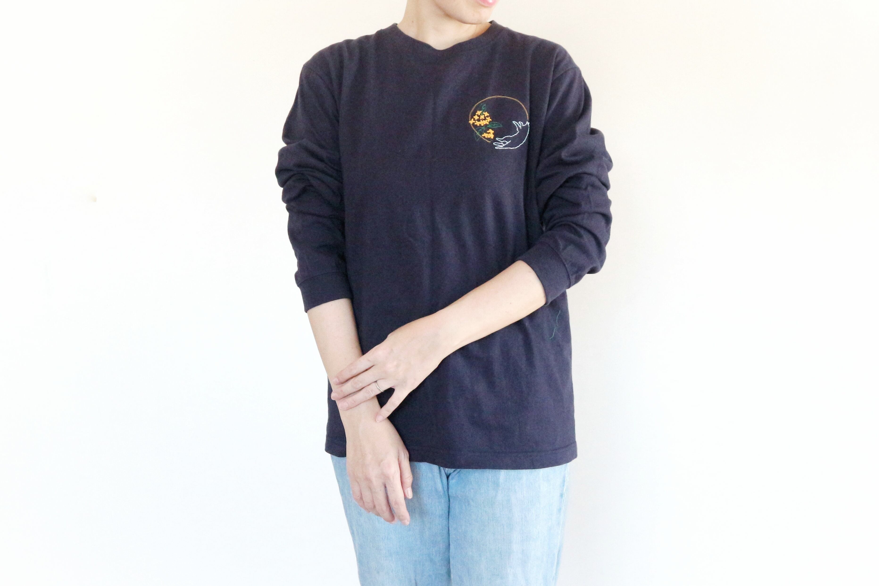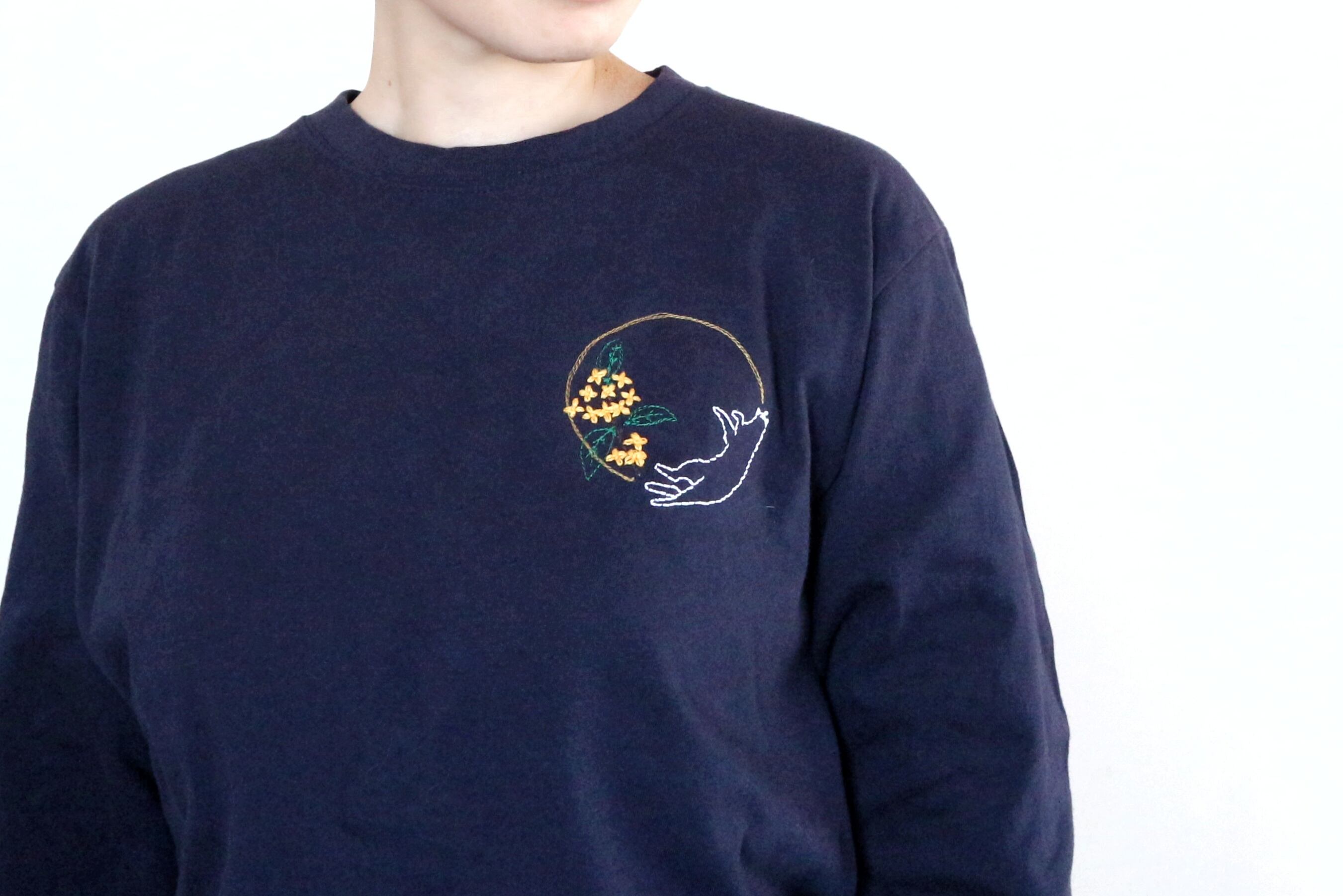 その記憶をたどるように、猫と金木犀をモチーフに刺繍しました。